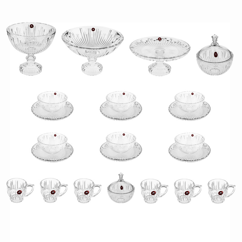 سرویس 23 پارچه شامل : 1 عدد از ظرف: میوه خوری - آجیل خوری - شیرینی خوری - شکلات خوری - قندان 6 عدد : فنجان - پیاله - پیش دستی
